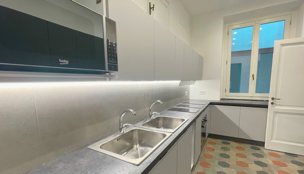 Cucina, soggiorno, sala da pranzo e lavanderia condivisi tra i 10 inquilini.
